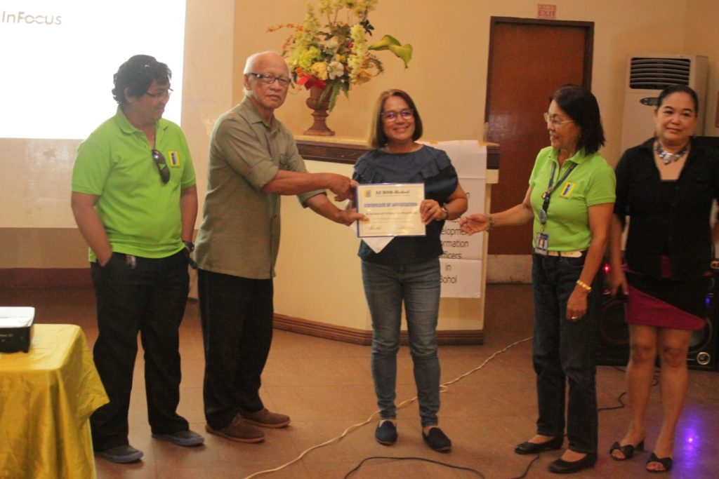 Officers of the Association of United Development Information Officers in Bohol (AUDIO Bohol) hand to BSP Information Officer Hazel Cultura a certificate for sharing the BSP’s amendment on bank rules that now opens the gates for small depositors. (rahc/PIA-7/Bohol)