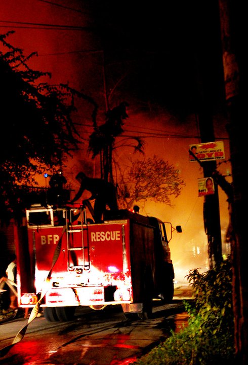 A huge fire consumed a couple of houses at corner JA Clarin and Tamblot St., Tagbilaran City, on the eve of February 24. Initial reports say the incident was caused by faulty electrical wiring, but authorities still have to confirm. Three firetrucks rushed to the site after a couple of minutes to turn down the flames; however, more than half of the houses have already been burned. Electricity was cut for a few minutes to prevent the fire from spreading. There were no reported casualties. (photo by Gerald James Cabal)